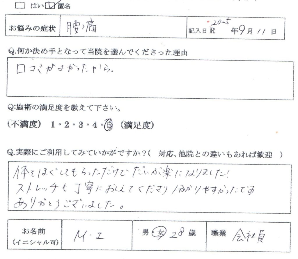 28歳 女性 会社員 M.I様 お悩み:腰痛