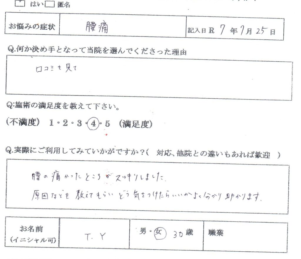 「腰の痛かったところがスッキリしました。原因なども教えてもらいどう気を付けたらいいかよく分かり助かります。」
