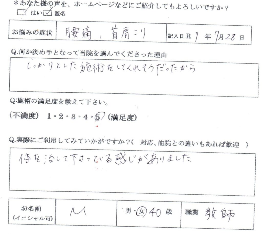 腰痛・首肩こりでお悩みの40代女性 教師の方の声