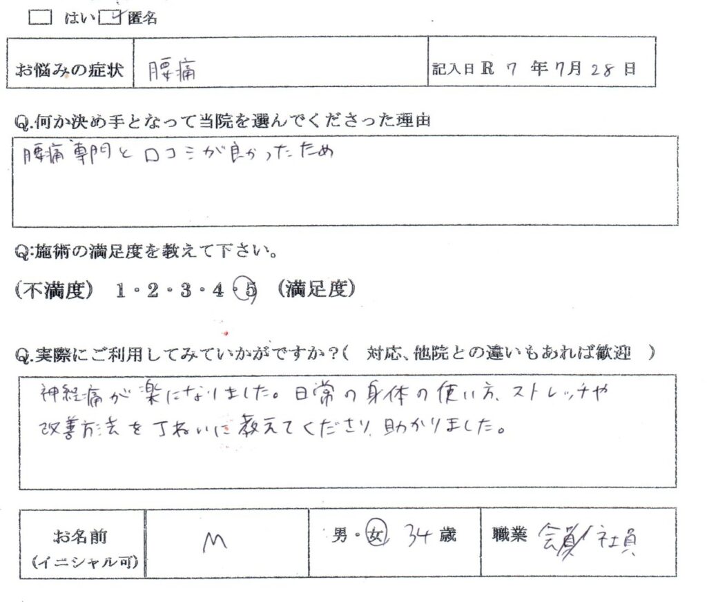 腰痛専門と口コミをきっかけにお越しになられた34歳女性の声
