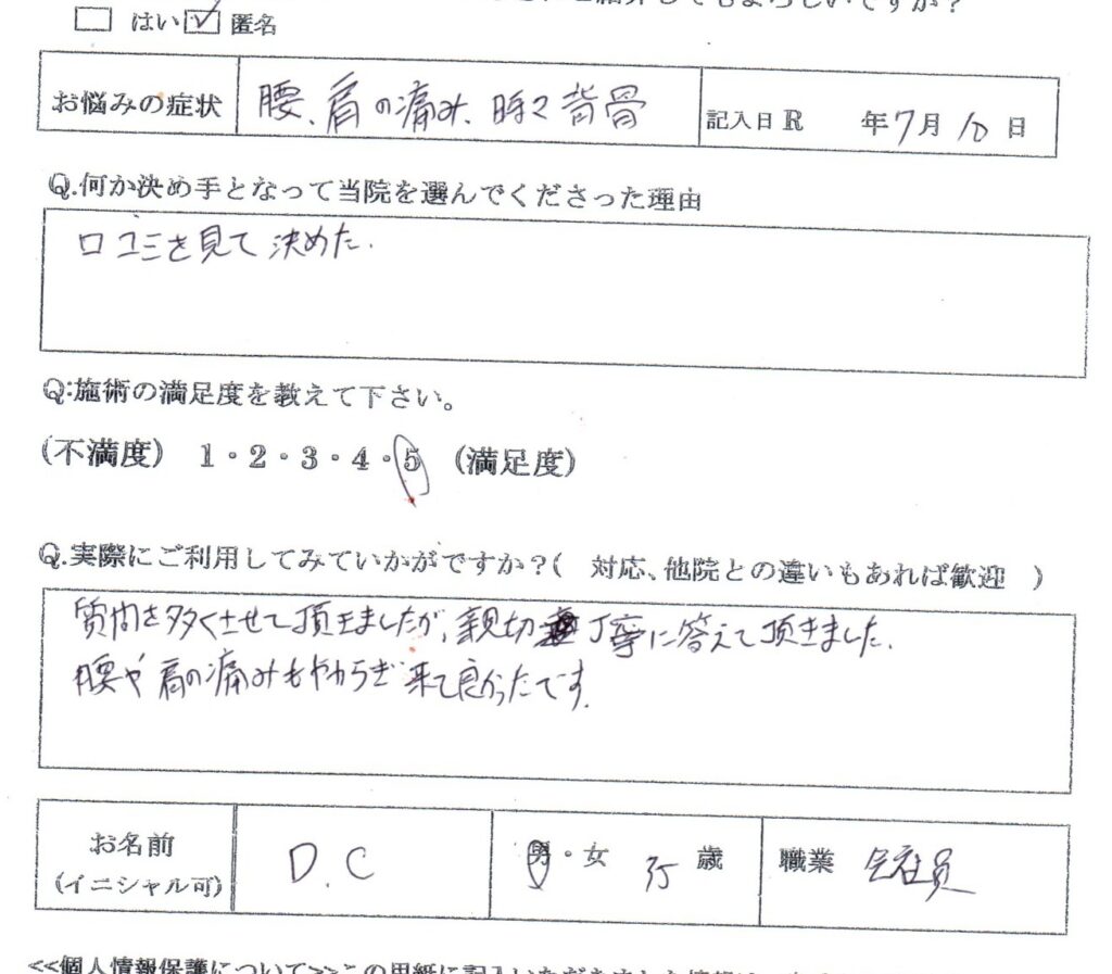 「質問にも親切丁寧に答えていただき、腰や肩の痛みもやわらいで来て良かったです」とのお声をいただきました。