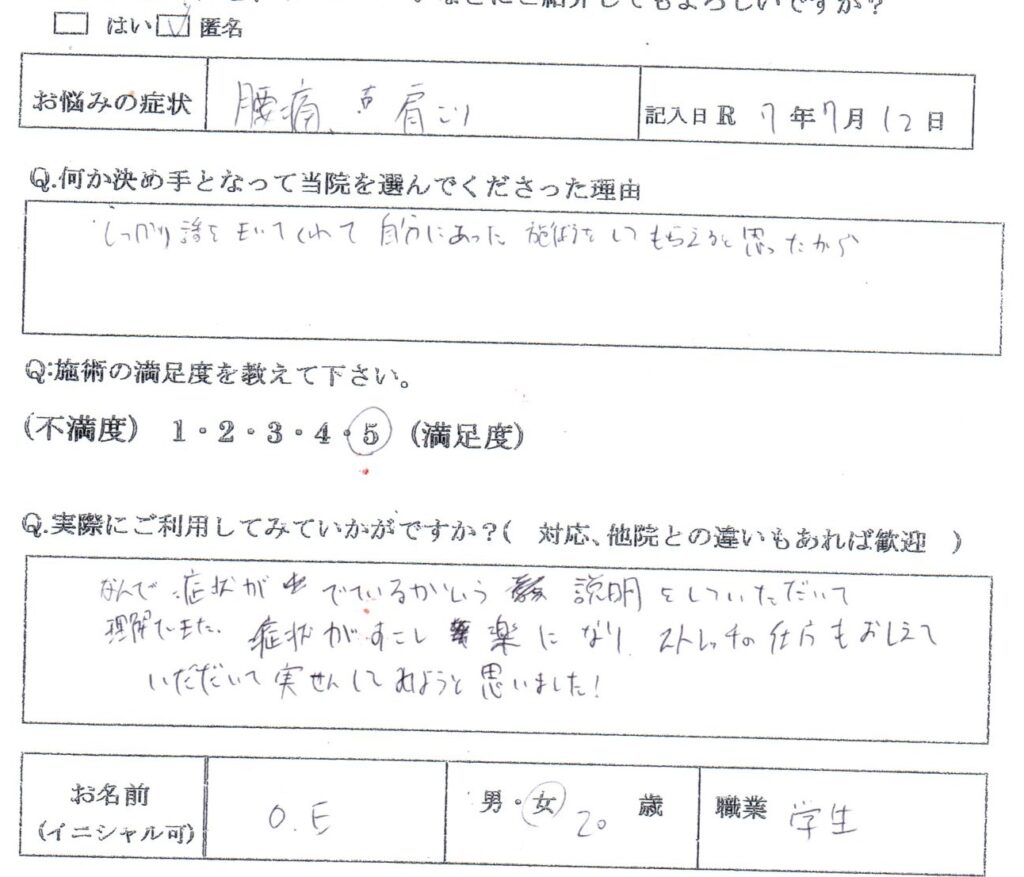 症状が出ている原因を丁寧に説明してもらえて理解できました。腰や肩の痛みも少し楽になり、ストレッチ方法も教えていただいたので実践してみようと思います!