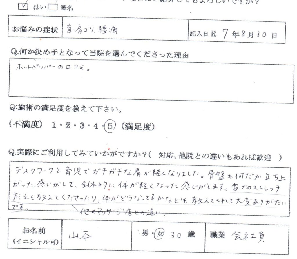 デスクワークと育児でガチガチな肩が軽くなりました。骨盤も何だか立ち上がった感じがして、全体的に体が軽くなった感じがします。他のマッサージ店との違い、家でのストレッチ方法を教えてくださっり、体がどうなっているかなども教えてくれて大変ありがたいです。
