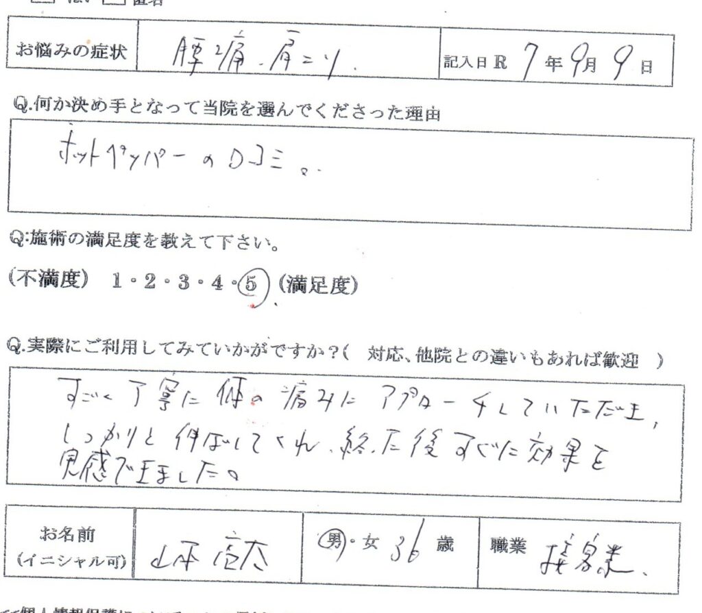 「すごく丁寧に体の痛みにアプローチしていただき、しっかりと伸ばしてくれました。終わった後はすぐに効果を実感できました。」