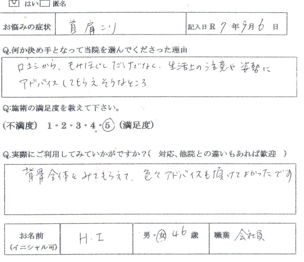 【ご来院のきっかけ】口コミで「もみほぐしだけでなく、姿勢や生活のアドバイスもしてもらえそう」と感じてご来院くださいました。