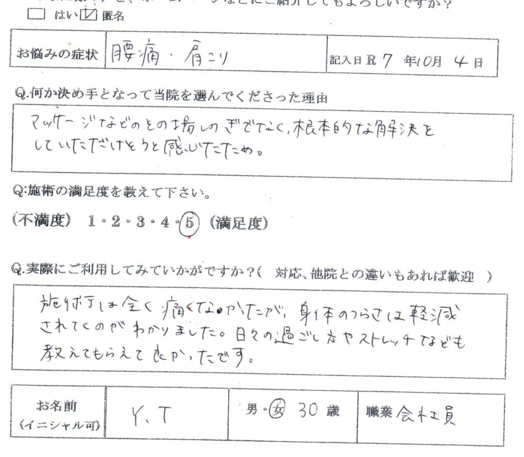 施術は全く痛くなかったが、身体のつらさは軽減されてくのがわかりました。日々の過ごし方やストレッチなども教えてもらえて良かったです。