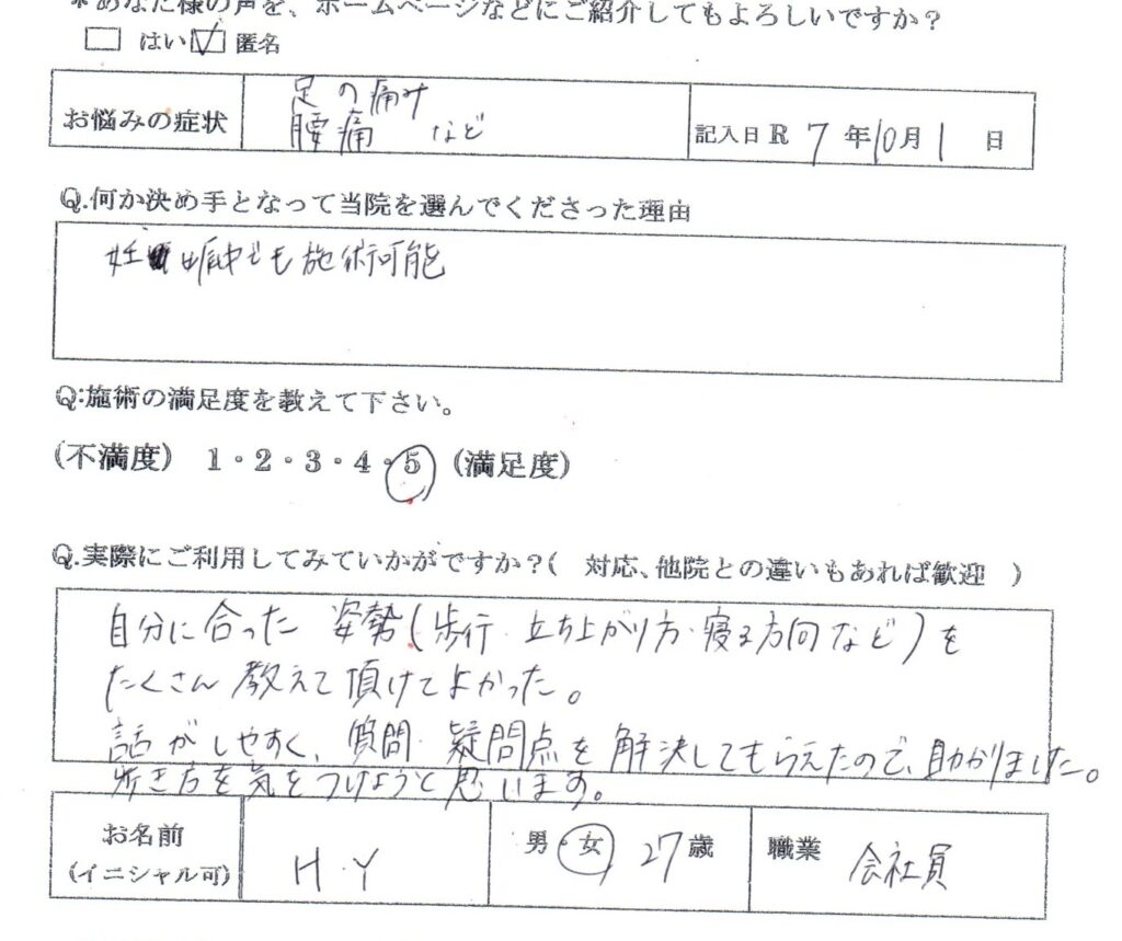 「自分に合った姿勢(歩き方・立ち方・寝る向きなど)をたくさん教えていただけてよかったです。