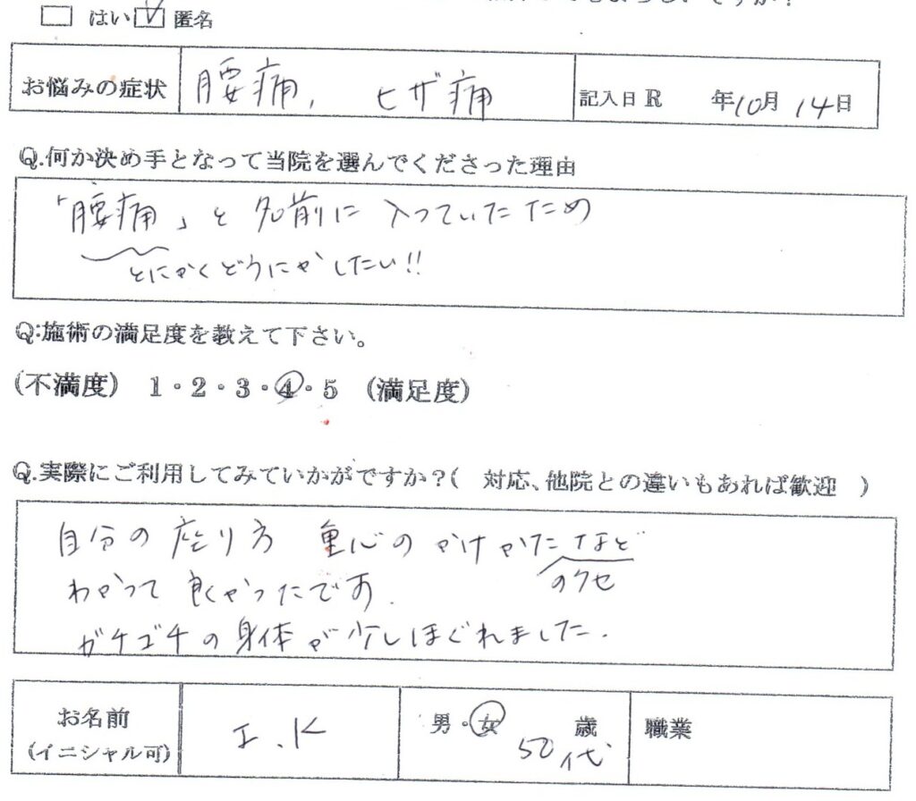 腰痛と膝の痛みでつらい日が続いていたとのこと、