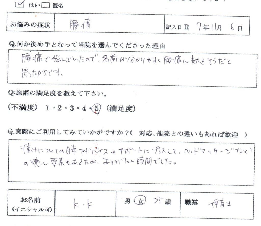 「痛みのアドバイスに加えて、ヘッドマッサージの癒しもありありがたい時間でした」