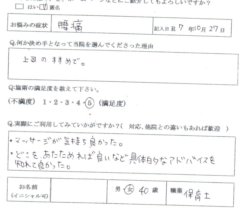 40代女性・保育士|腰痛(過去に三回ギックリ腰)