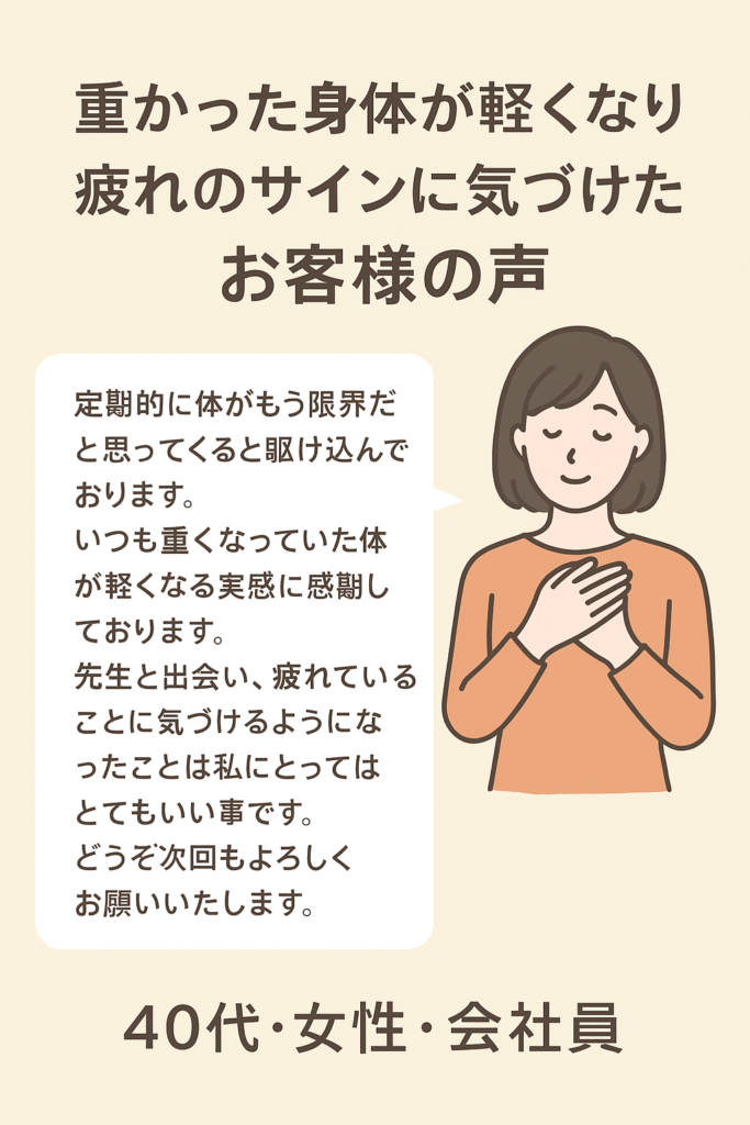 いつも重くなっていた体が軽くなる実感に感謝しております。