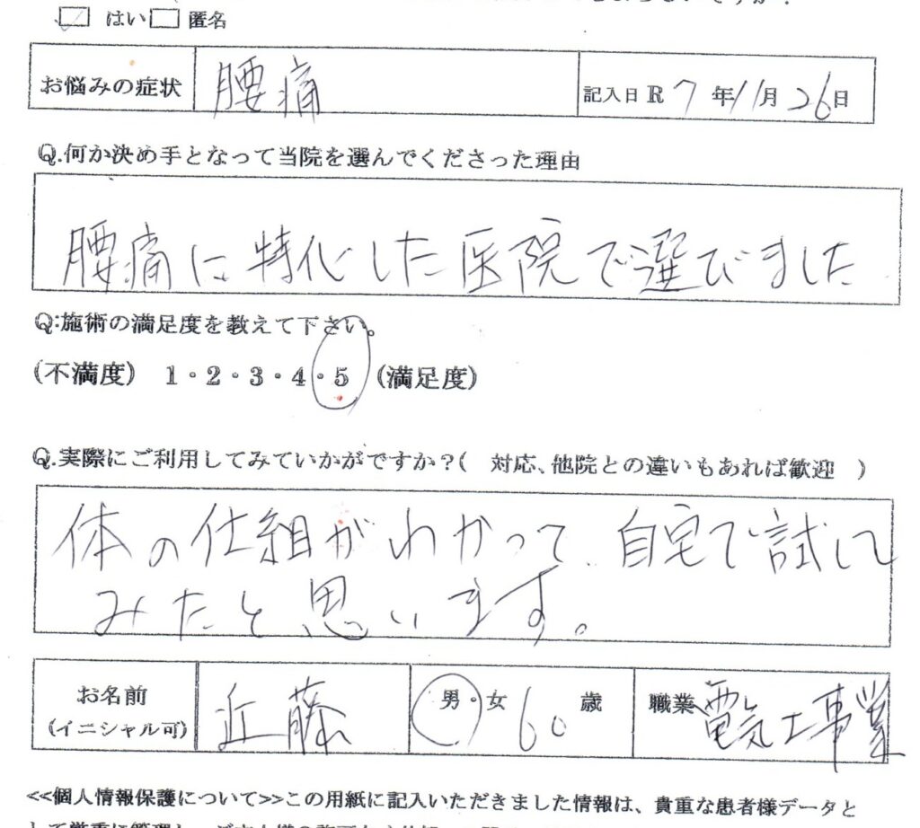 現在の姿勢のクセと腰への負担を理解していただいた上で施術を行いました。