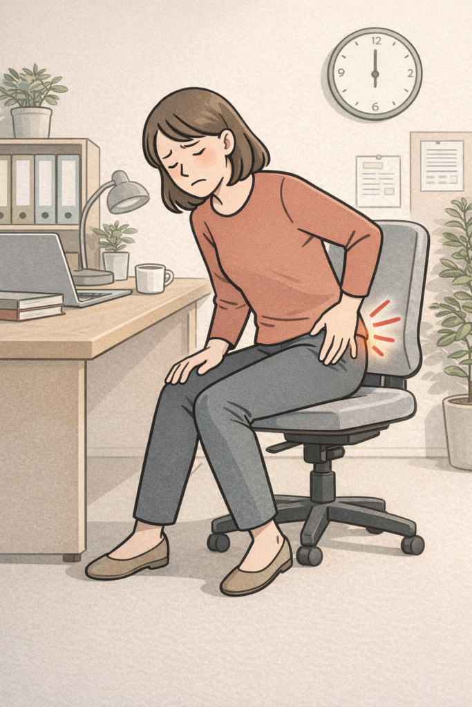 座り仕事が長い方に多い腰痛や股関節痛、骨盤の歪みは、